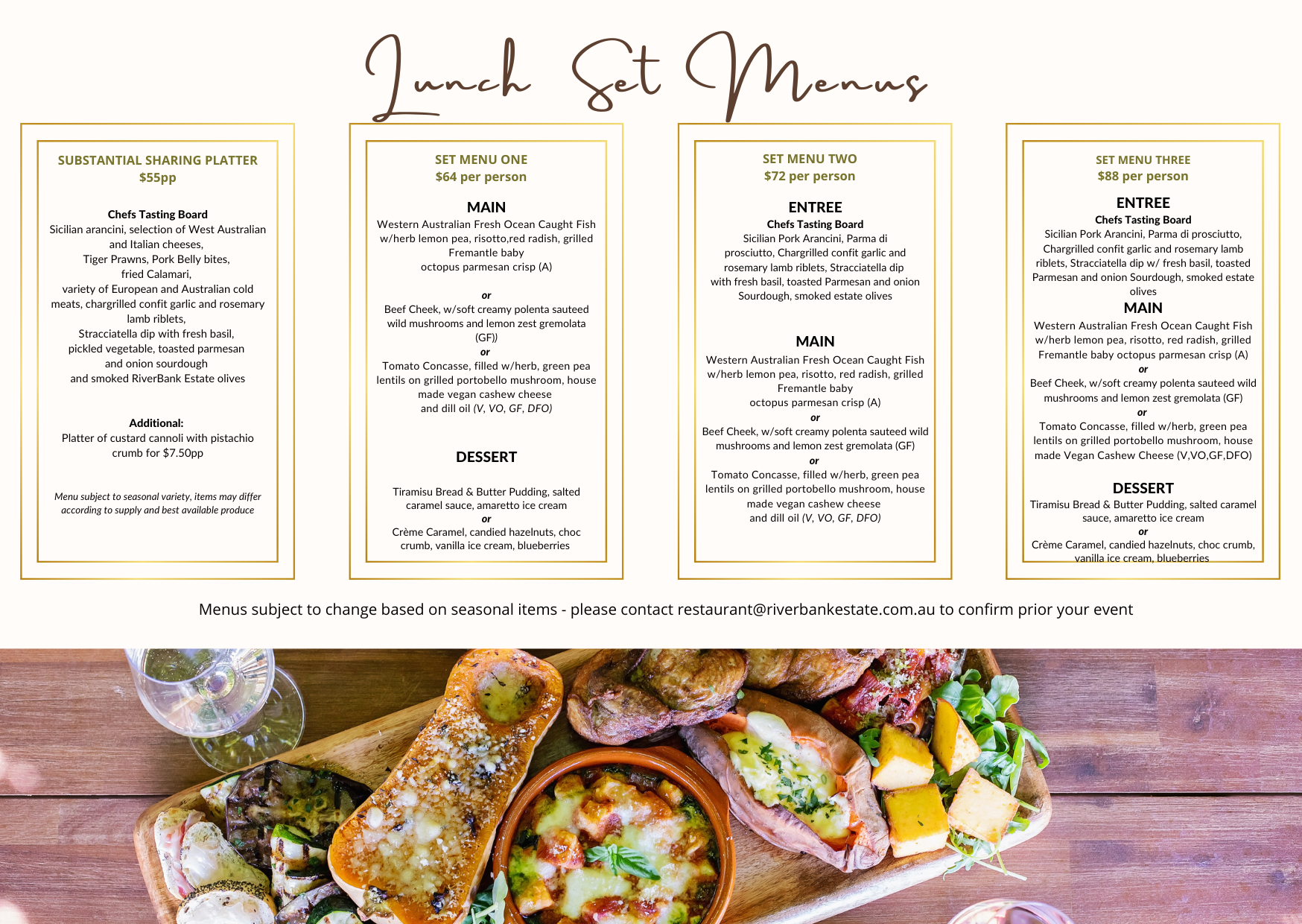 Please note that these menus do change frequently. Contact us for our most recent menus.