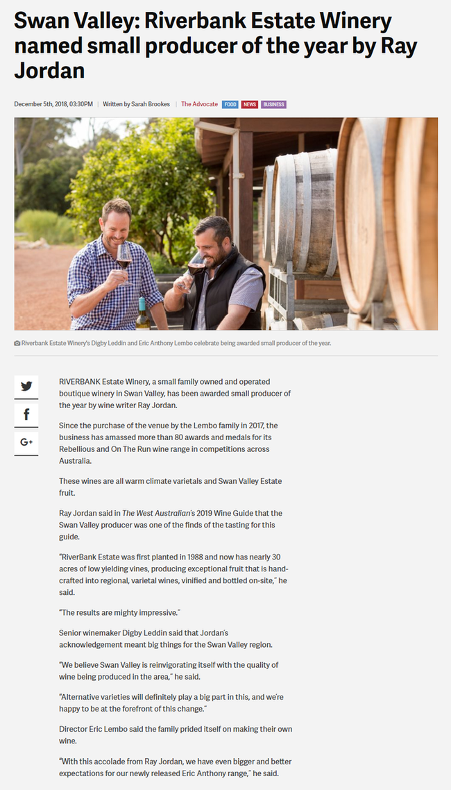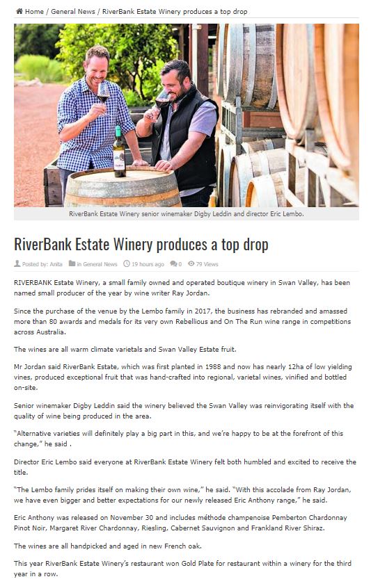 Swan Valley: Riverbank Estate Winery named small producer of the year by Ray Jordan