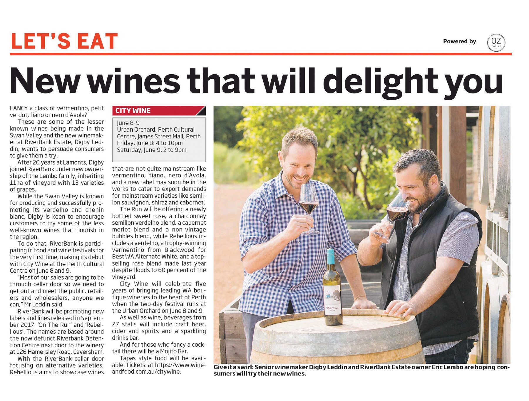 To do that, RiverBank is participating in food and wine festivals for the very first time, making its debut with City Wine at the Perth Cultural Centre on June 8 and 9.