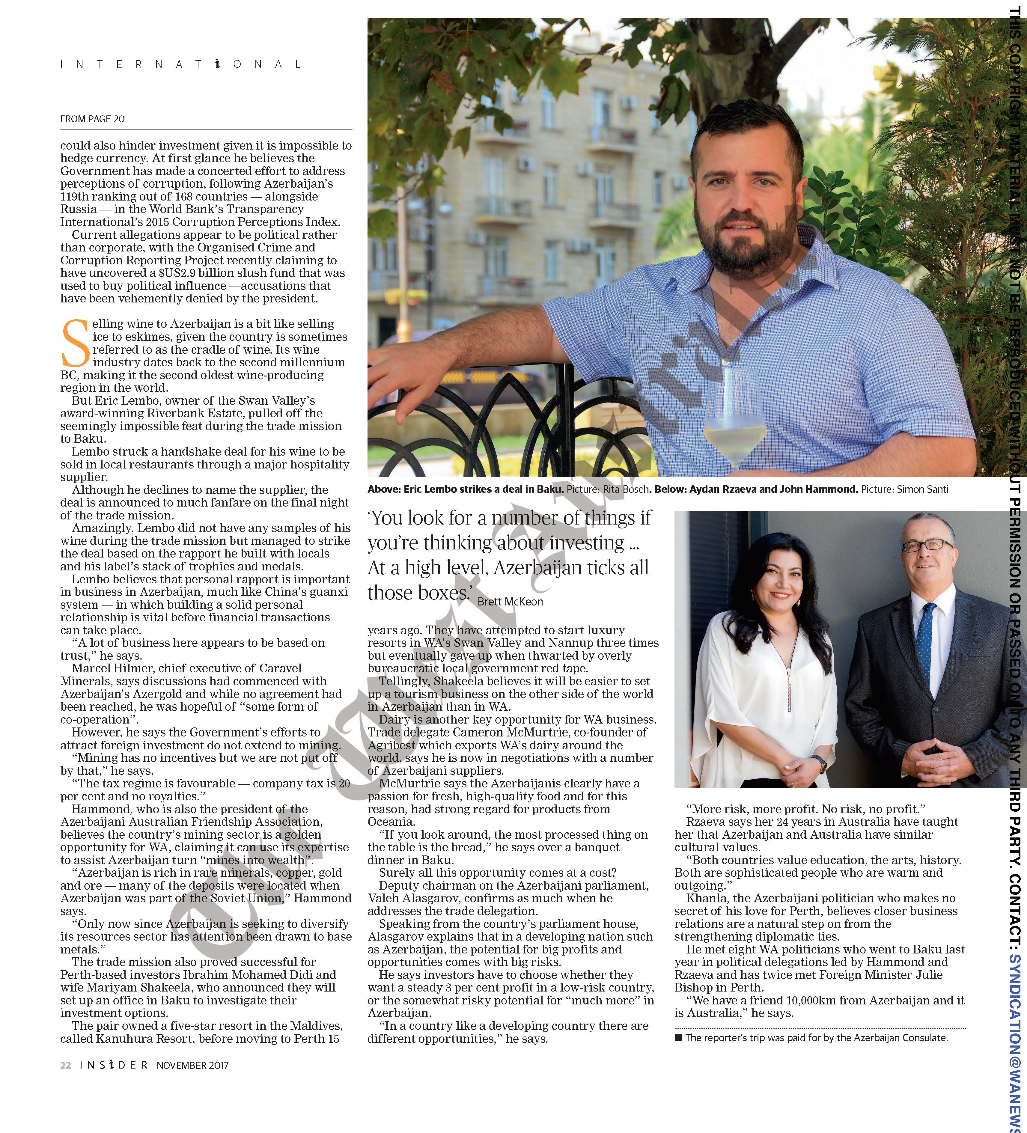 But Eric Lembo, owner of the Swan Valley's award-winning Riverbank Estate, pulled off the seemingly impossible feat during the trade mission to Baku.