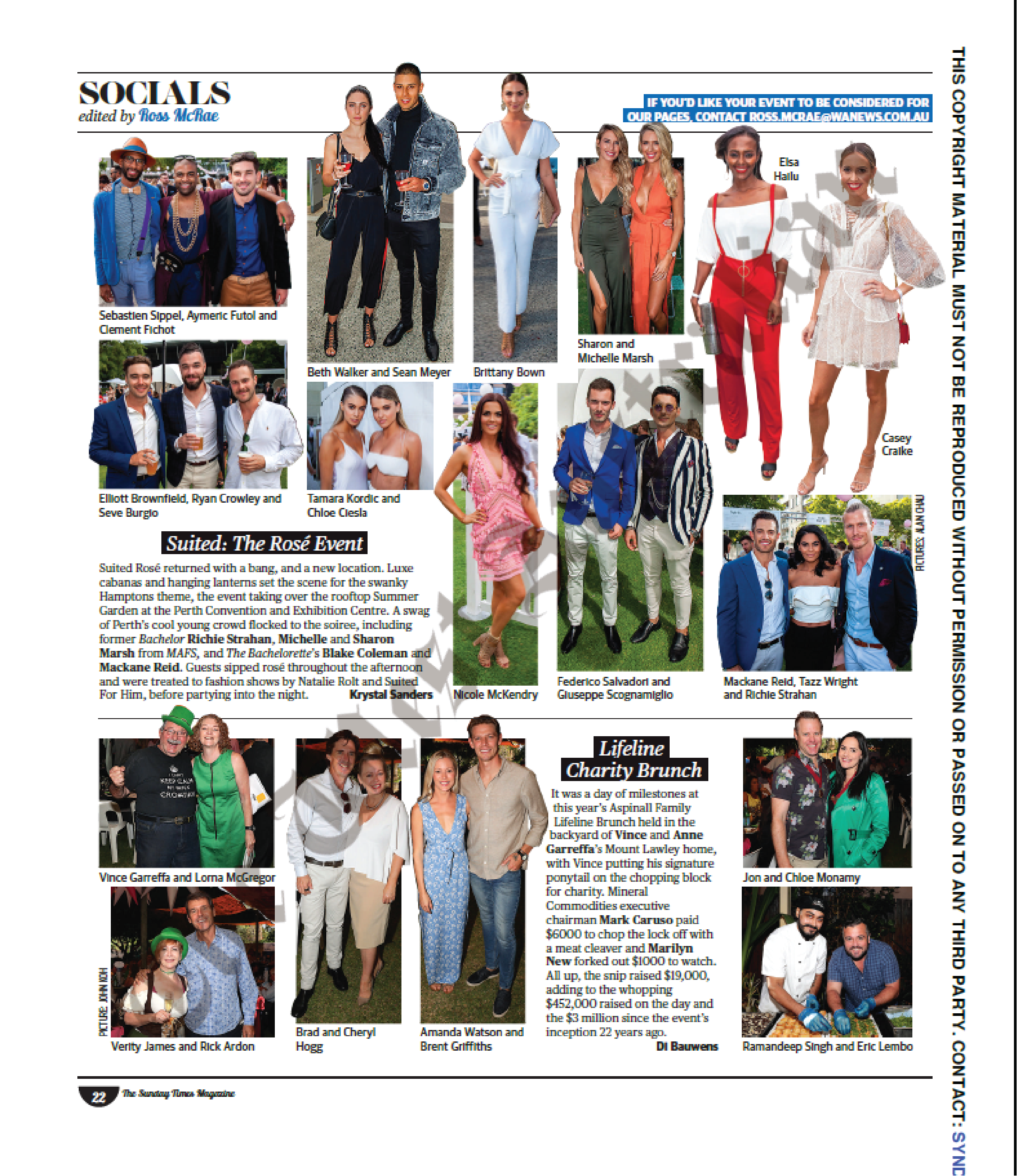 It was a day of milestones at this year’s Aspinall Family Lifeline Brunch held in the backyard of Vince and Anne Garreffa’s Mount Lawley home, with Vince putting his signature ponytail on the chopping block for charity. Mineral Commodities executive chairman Mark Caruso paid $6000 to chop the lock off with a meat cleaver and Marilyn New forked out $1000 to watch. All up, the snip raised $19,000, adding to the whopping $452,000 raised on the day and the $3 million since the event’s inception 22 years ago.